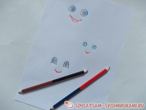 7. Осталось нарисовать глазки и улыбку, вырезать и приклеить. Почему используем карандаши, а не фломастеры? Известно, что при соприкосновении с жидким клеем, фломастеры сразу подтекают. Качественные карандаши дают яркие устойчивые цвета. Нарисуйте несколько вариантов и подберите самый подходящий из них.