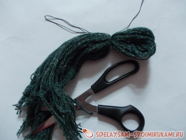 4. Взяв в руку неразрезанный край-комок, нужно его перевернуть и равномерно распределить нити по кругу так, чтобы они красиво закрыли основание – как расчесывают парик. Удобно выполнять этот шаг, разместив заготовку на столе.