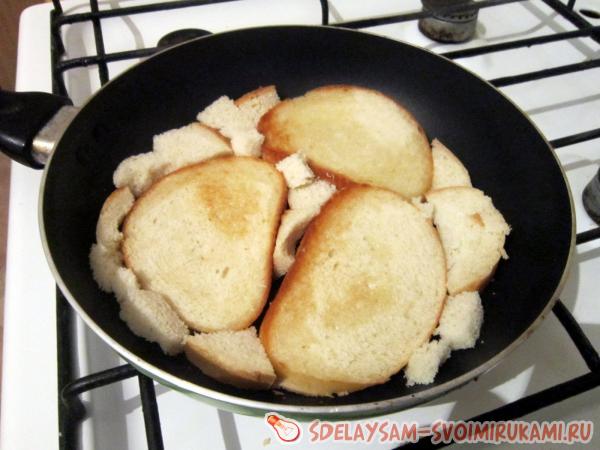 4. Слегка поджариваем хлеб с одной стороны и переворачиваем. Все пустоты, имеющиеся между ломтями батона, заполняем небольшими кусочками хлеба.