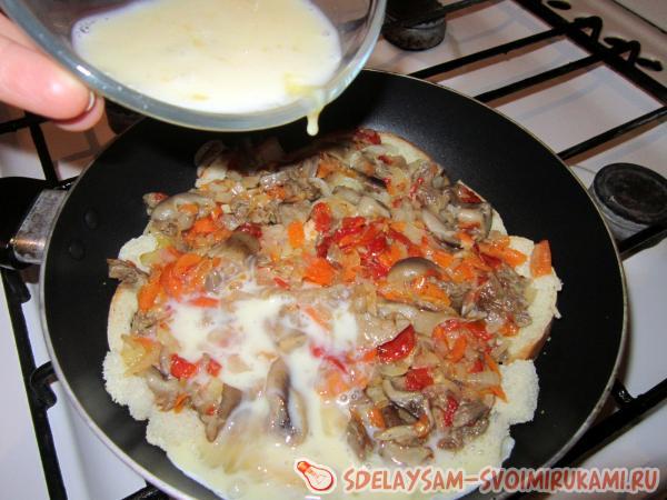 6. Выкладываем на «корж» из батона начинку и равномерно поливаем ее взбитыми яйцами.