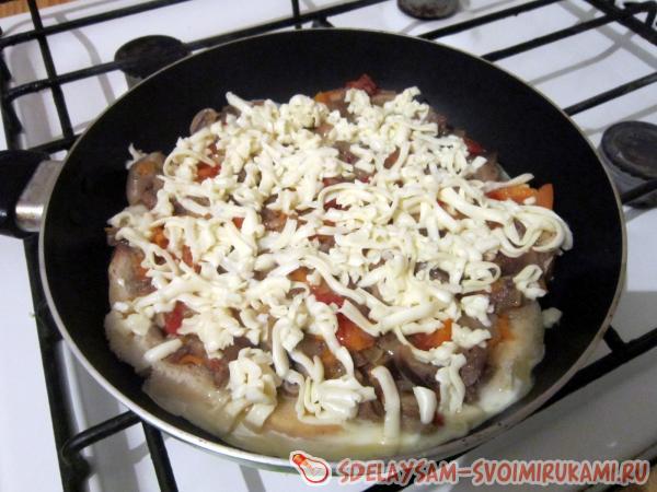 7. Посыпаем пиццу тертым сыром, накрываем сковороду крышкой. Убавляем огонь до минимума. Время приготовления около 10 минут (ориентируйтесь по готовности яичной заливки).