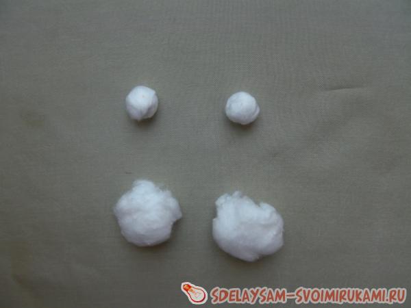 • Приготовьте 2 маленьких комочка ваты для ручек и 2 размером побольше для ножек.