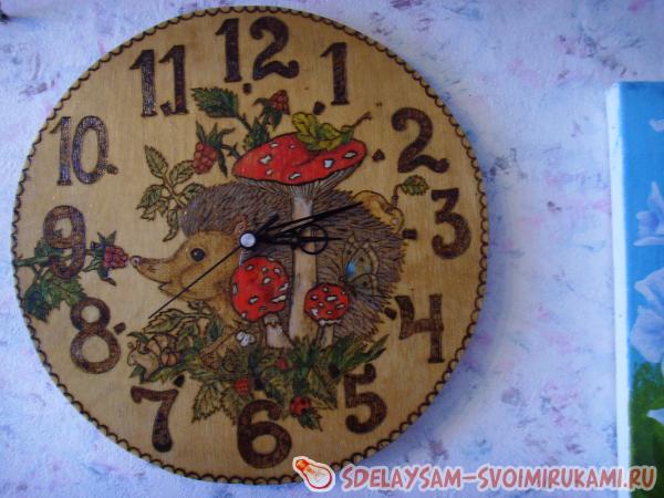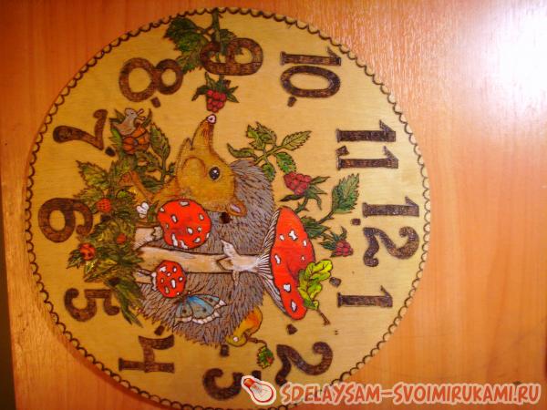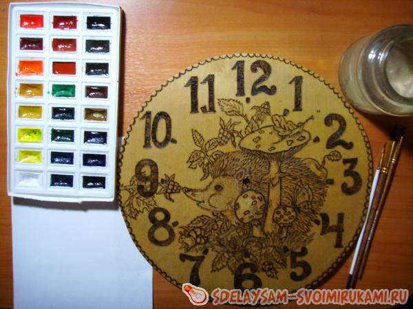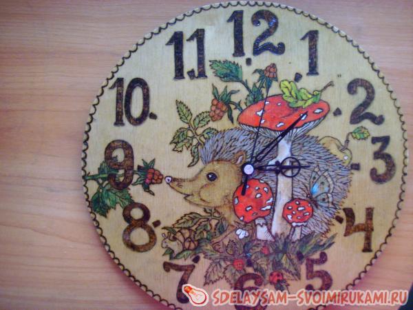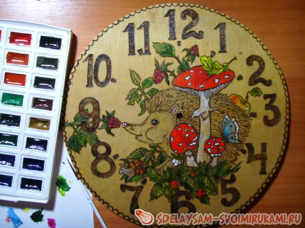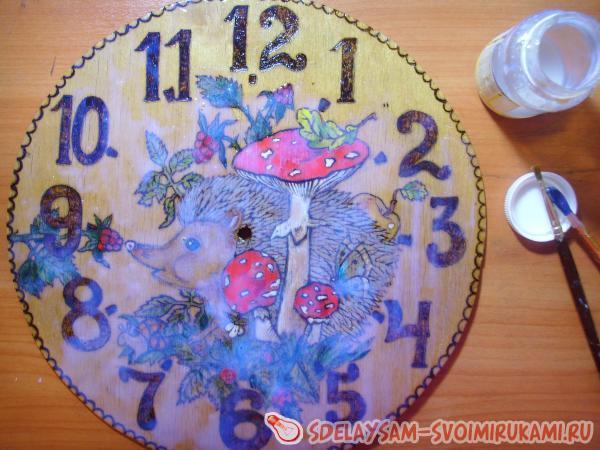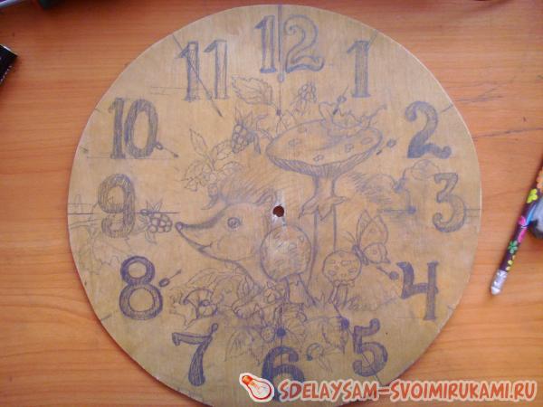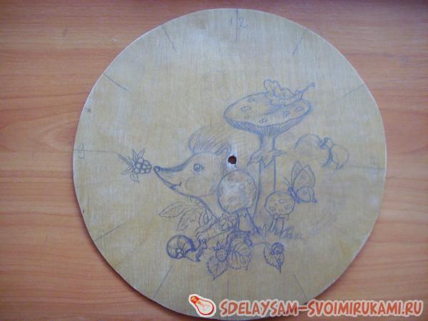 1. Сначала вам надо решить, что именно вы изобразите на часах. Это может быть как любимый сказочный или мультипликационный герой вашего малыша, так и просто симпатичный зверек. Я выбрала маленького ежонка, который знакомится с окружающим его прекрасным миром. Карандашом сделайте набросок будущей картины. Если вы совсем не умеете рисовать, то просто при помощи копирки переведите рисунок из детской книги.