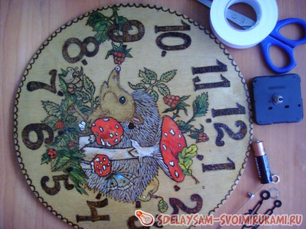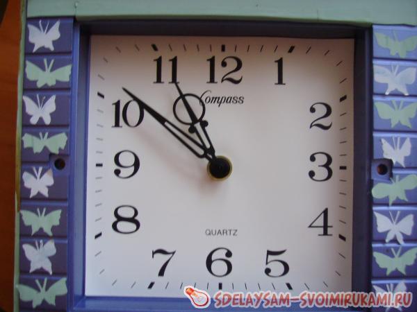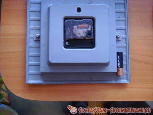 7. Дождавшись полного высыхания лака, можете приступать к сборке часов. С помощью двустороннего скотча закрепите механизм с обратной стороны. Затем вставьте батарейку. Перевернув часы, прикрепите стрелки: часовую, минутную и, наконец, секундную. Установите время.