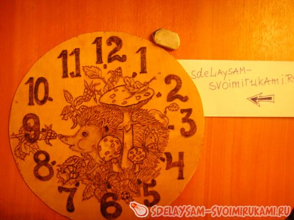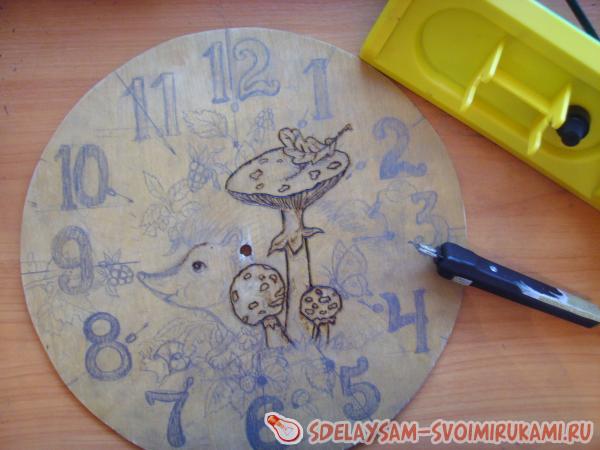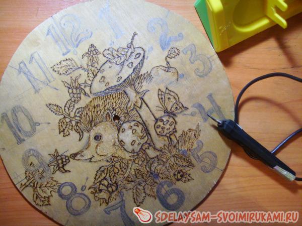 4. Включите прибор для выжигания. Дождитесь, когда наконечник нагреется достаточно сильно. Выжигайте картинку, обводя рисунок по контуру. Цифры выжигайте, полностью заполняя их. При этом лучше всего установить мощность выжигательного аппарата на максимум, это позволит вам сэкономить время.