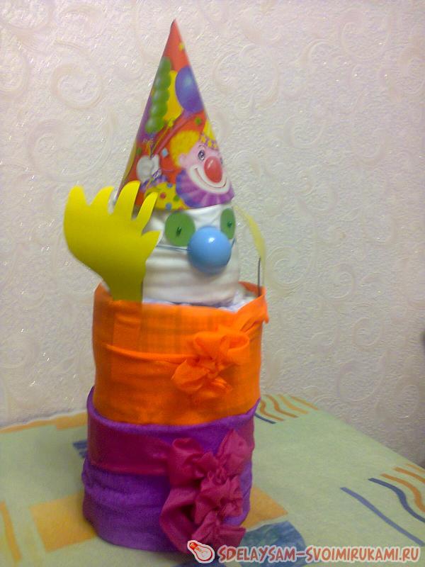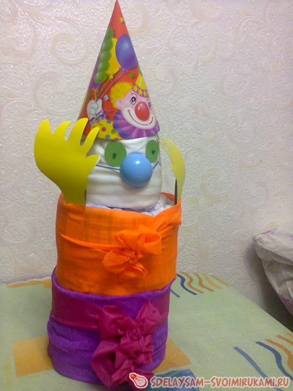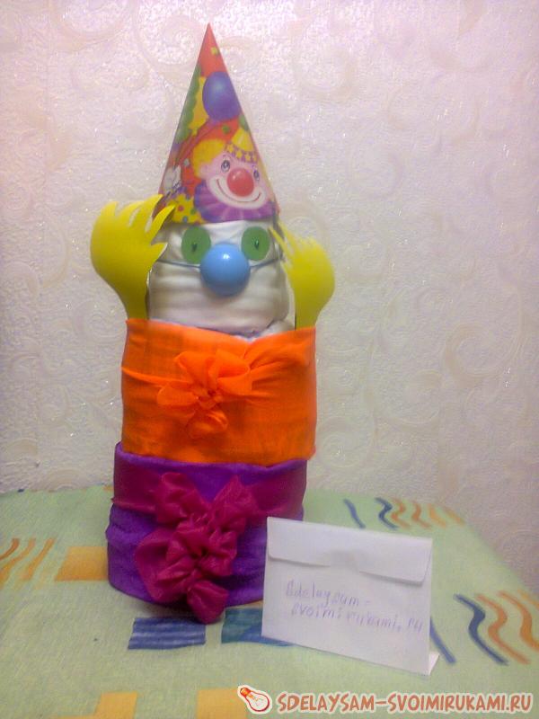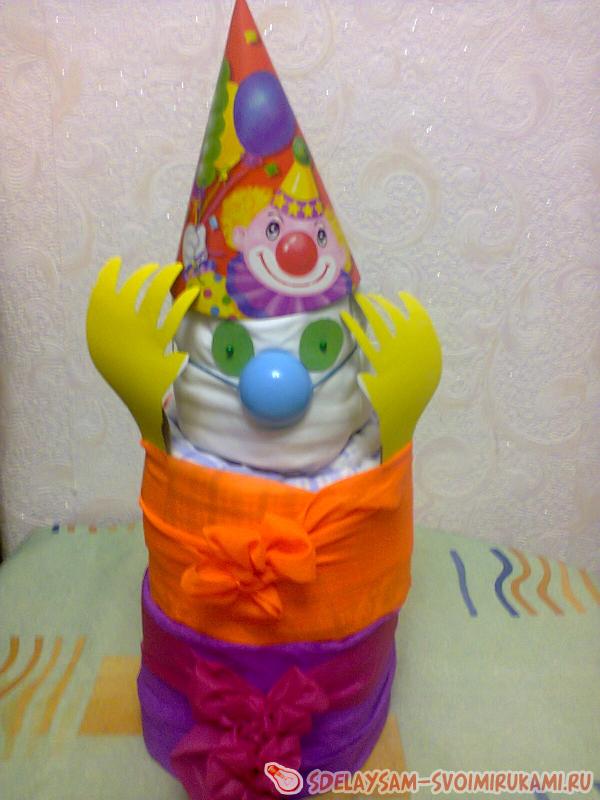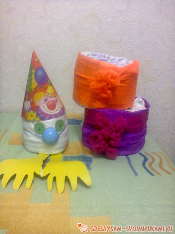 Предлагаю рассмотреть технологию изготовления клоуна из одноразовых подгузников. Для создания такого подарка вам потребуется большая или средняя пачка памперсов, в зависимости от желаемых габаритов изделия, которое вы хотите увидеть на выходе, праздничный колпачок, цветная бумага, ленты, иголки с бусинами, английские булавки, крышка от шампуня для создания носа, картон.