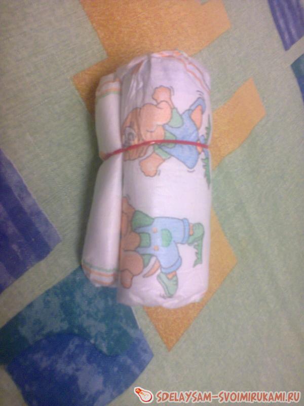 1. Скручиваем подгузник по длине в виде рулетиков. Для первого и второго слоя вам потребуется по 12 -15 подгузников. Для головы клоуна достаточно будет трех подгузников, скрученных в рулетики.