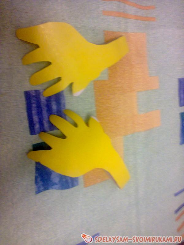 5. Изготавливаем руки. Для этого берем лист картона, сложенного вдвое, рисуем изображение рук клоуна и вырезаем по контуру – руки готовы. Рисунок№6. Осталось только закрепить их на теле клоуна, вставив между слоями подгузников и лент.