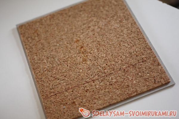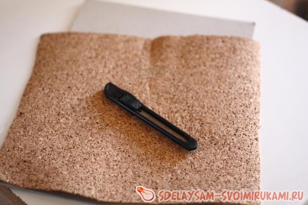 Лист плотного картона и пробковую подложку обрезаем в форме прямоугольника так, чтобы края картона немного выступали.