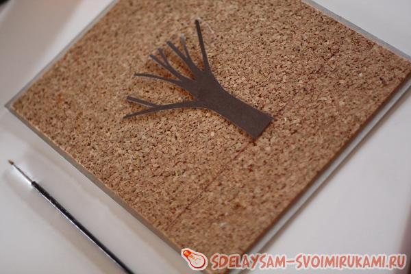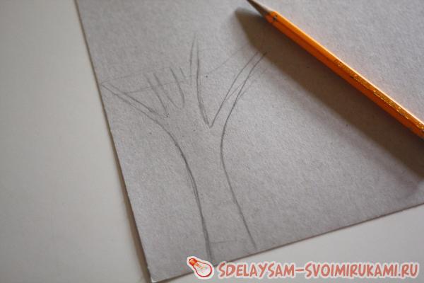 Теперь можно рисовать и приклеивать ствол дерева. Для работы с универсальным клеем удобно использовать старую кисточку или ватную палочку. После склеивания они просто выбрасываются.