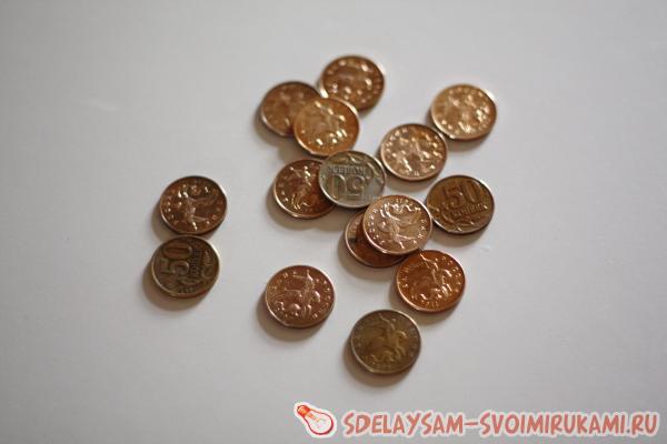 Слой «земли» лучше всего изготовить из монет в 10 и 5 копеек. Если использовать рубли и монеты по 50 копеек, себестоимость сувенира сразу возрастает. Но даже при использовании крупных монет, поделка обойдётся не более чем в 20 рублей.