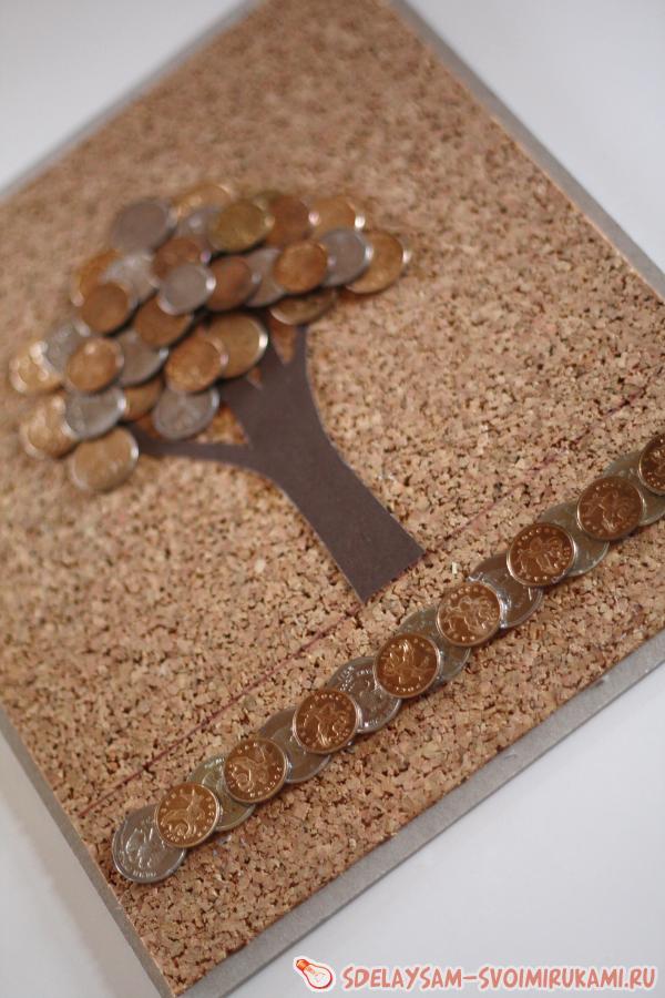 Приклеиваем монеты универсальным клеем к пробке в форме кроны дерева.