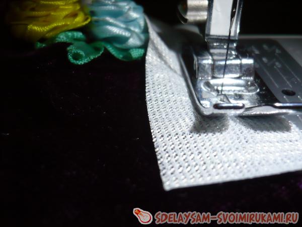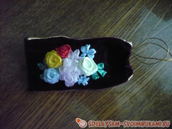 Теперь ранее приготовленные розочки пришиваем на будущий мешочек, пришиваем крепко, но осторожно, чтобы ткань не деформировалась, бархатная ткань может повредиться и от иглы, поэтому аккуратно примериваем каждый цветочек, и пришиваем его, чтобы не наделать дырок в ткани.