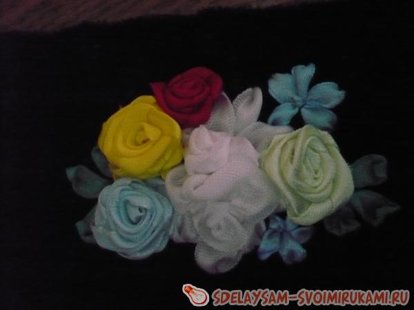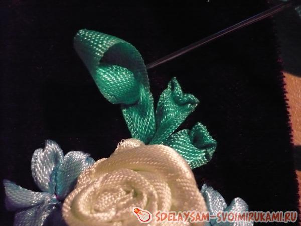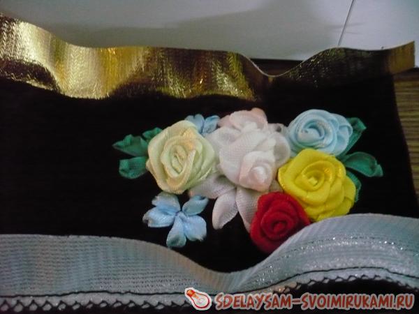 После того как розочки пришиты, делаем лепестки вокруг розочек, для этого берем иглу для лент и ленты, и осторожно не повреждая ткань вышиваем лепестки.