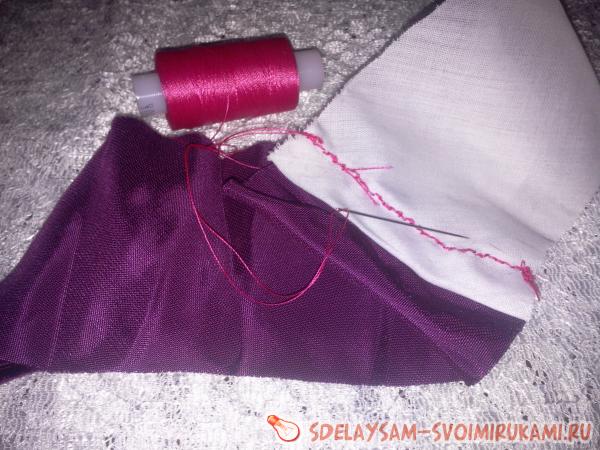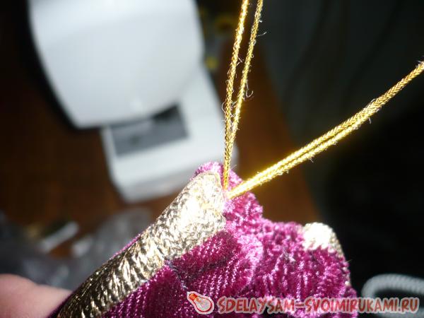 Золотую ткань пришиваем очень осторожно и незабываем что, нам будет необходимо просунуть шнурок в уже подготовленное ранее место.
