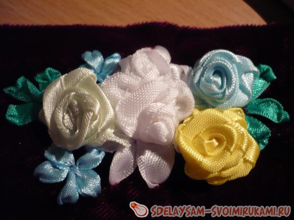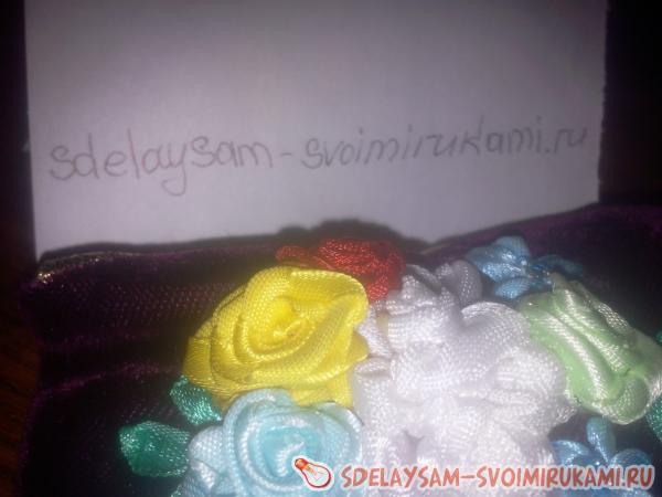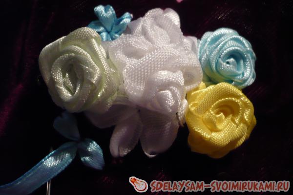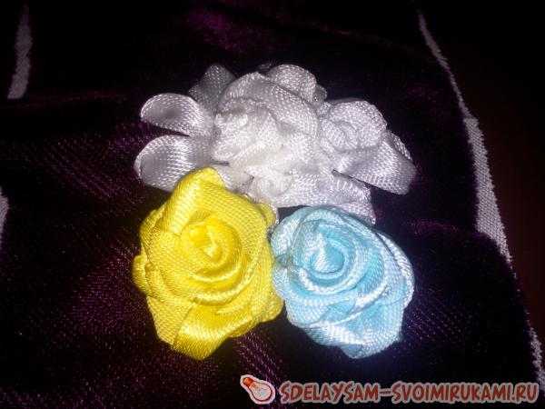 Затем с помощью иглы с нитью и лент накручиваем розочки, делаются розочки быстро и не трудно, главное каждый завиток подшивать ниточкой, завитки сильно не затягивать, размер розочек выбираете сами, я сделала их небольшими.