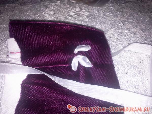Из бархатной ткани вырезаем полоску для будущего мешочка, то есть размер мешочка определите сами, после чего лавсановой нитью делаете наброски, подвернув ткань для шнурка.
