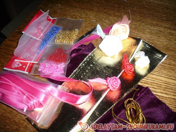Нам понадобится: Бархат, шнурок, ткань золотого цвета, ленты, бисер, нить лавсановая и капроновая. Иглы для бисера, иглы для лент, ножницы, булавка.