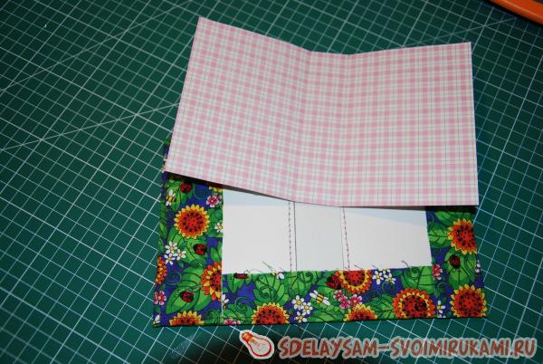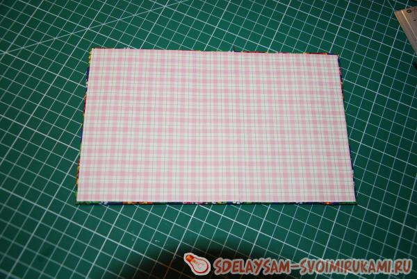 Чтобы скрыть черновую работу, спрятать края ткани, машинную строчку, наклеим на изнаночную сторону обложки цветную бумагу для скрапбукинга. Бумага по размеру в периметре должна быть меньше обложки на 2мм, т.е. 12,8*20,8см.