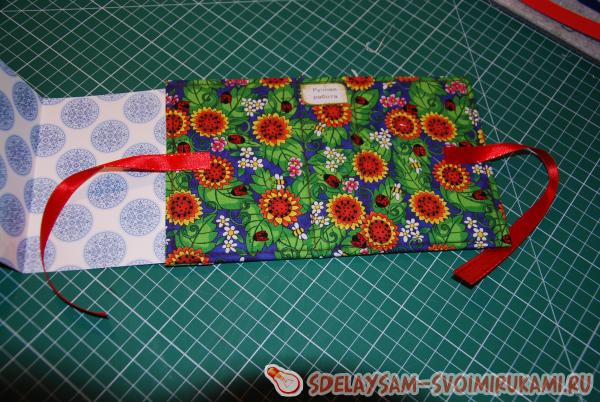 Осталось приделать завязочки и украсить книжечку-визитницу. Для этого возьмём ленточку, разрежем её пополам, зажигалкой подожжём края, чтобы не распускались и приклеим ленточки к обложке так, как показано на фотографии.