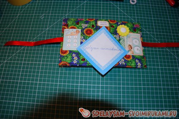 Чтобы спрятать концы ленточек, украсим книжечку остатками бумаги для скрапбукинга и прикрепим цветочек. Я его приклеила клеем «Момент» - гель прозрачный. Вот такая книжечка-визитница у меня получилась.