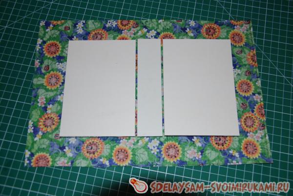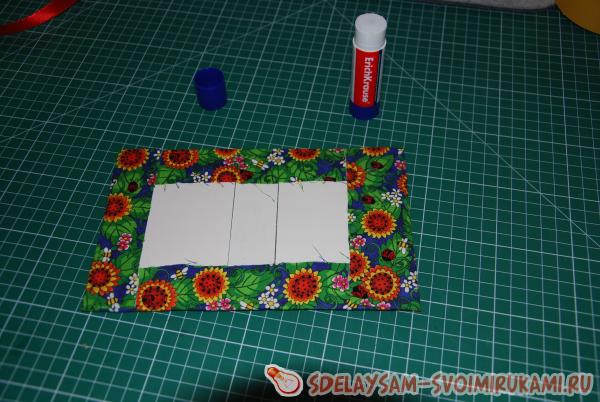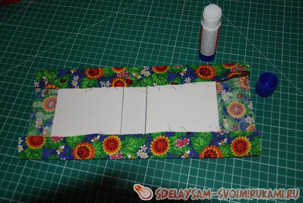 Хорошо промазываем края картона клеем-карандашом, загибаем на него ткань и приклеиваем.