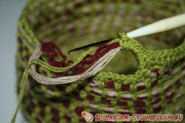 Последний ряд надо связать с ручками. Делаются они из нити-основы. Она поднимается вверх на размер ручки, а обвязочной ниткой продолжаем вязать дальше по ряду.