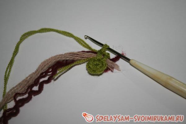 Первый ряд у нас будет состоять из шести столбиков без накида. Затем стягиваем петлю амигуруми и соединяем последний столбик с первым. Далее прикладываем нить-основу и начинаем ее обвязывать.