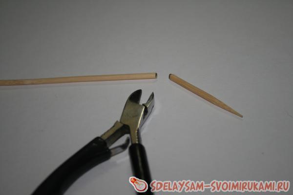 После этого, с помощью кусачек, надо сделать несколько «укусов» по кругу и только после этого сильно надавив на ручки кусачек отрезать лишний кусок. Делать надо именно так, чтобы отрезанный конец шпажки был максимально ровным.