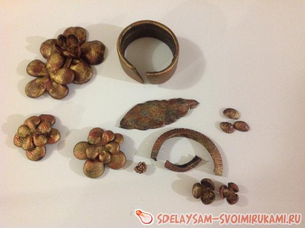 И так на всех цветках. На веточки приклеить бутончики и маленький цветочек. Первым клеить листок, потом веточки и жгутик, потом цветы. Ваш браслет готов.