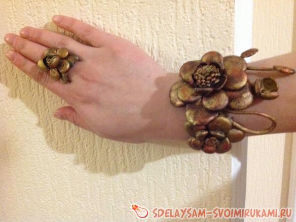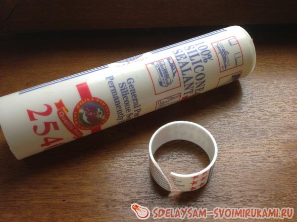 Пока сохнут детали, подготовьте основу для браслета. Плотная пластиковая бутылка строительного силикатного клея хорошо подходит для основы. Она не сгибается, плотно сидит на руке. Ножом разрезать бутылку на нужную вам ширину, разделить полученное кольцо как показано на фото.