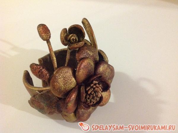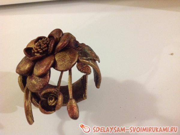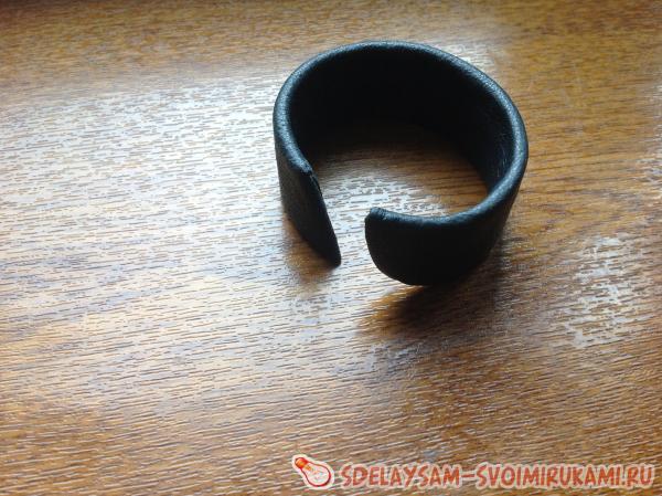 Теперь надо обтянуть основу кожей. Ширину полоски кожи для обтягивания основы браслета надо рассчитать так, что бы отрезок полоски мог обхватить основу с внешней и внутренней стороны. Густо смазать клеем ПВА замшевую сторону и аккуратно обтянуть основу браслета. Чтобы кожа легко ложилась, можно лицевую сторону протереть мокрой салфеткой. Дать просохнуть клею, после чего покрасить так же как цветы.