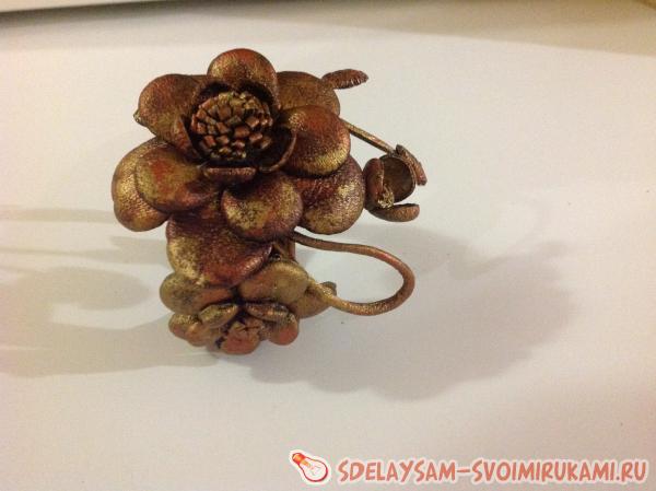 Красить лучше акриловой краской металлик не кисточкой, а губкой, слегка прикасаясь к коже. На фото три цвета красок: золотая, бронзовая, бирюзовая. С начала нанесите золотую с изнаночной и лицевой стороны, потом местами бронзовую, а на листок и бирюзовую. Краска быстро сохнет, металлик придаёт свежесть и блеск. Что даёт изделию вечерний нарядный вид.