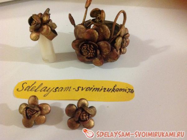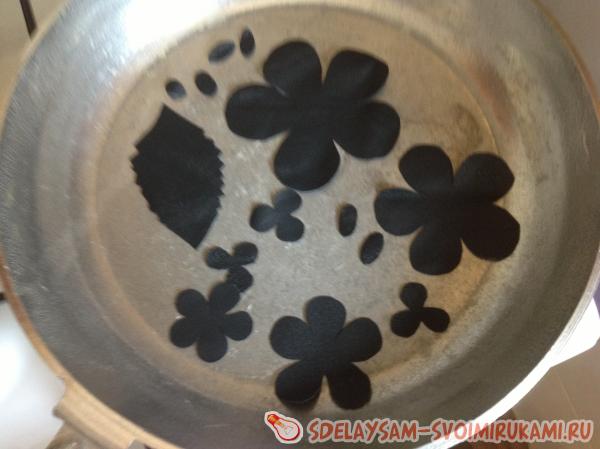 Поставьте сковородку на средний огонь. Лучше использовать наши старые сковородки. Выложите на неё готовые детали цветов.