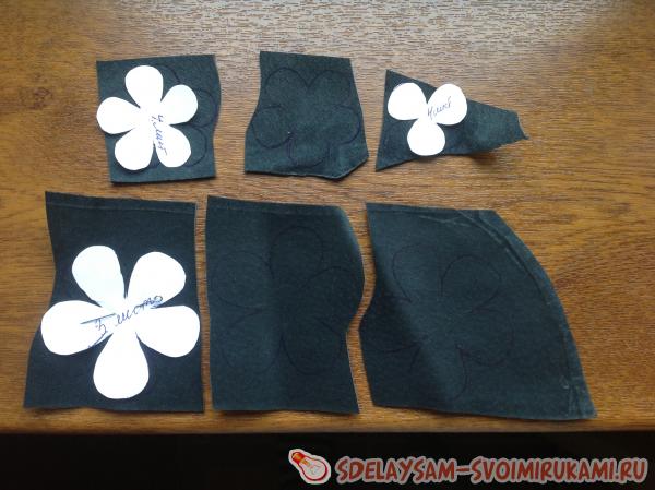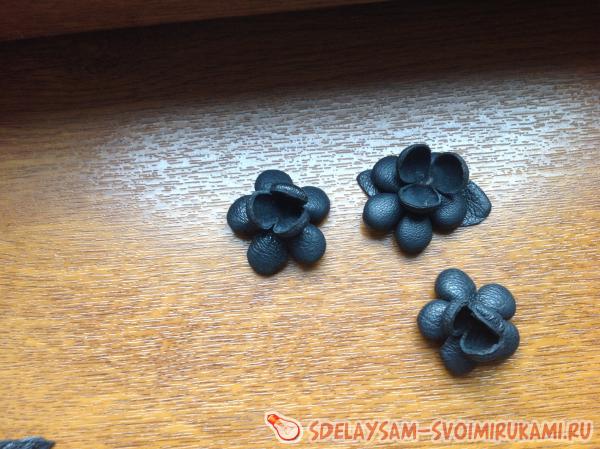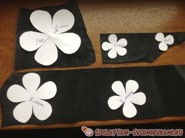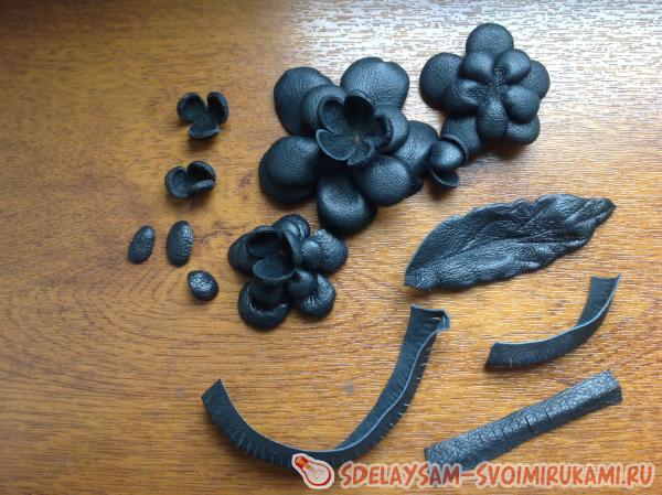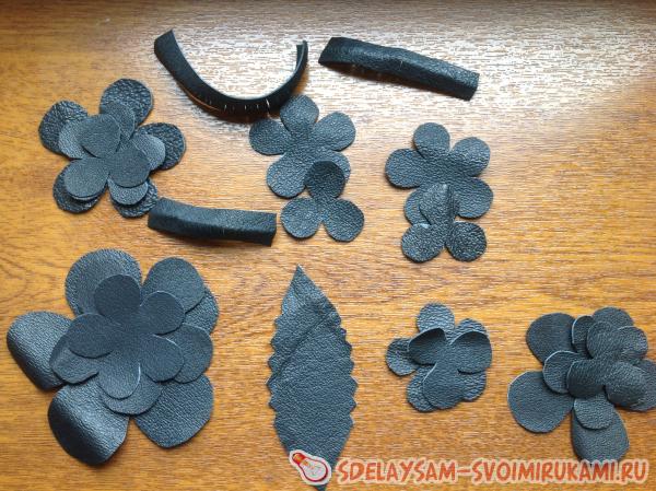 Подобрать кусочки кожи и сделать выкройки цветов на бумаге, как показано на фото.