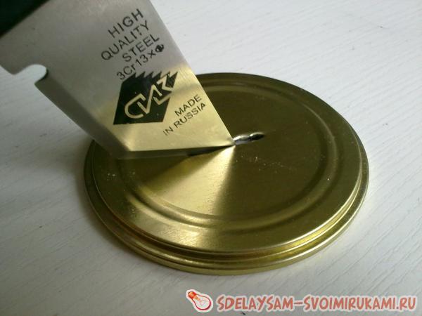 Для начала берём закаточную крышку и проделываем в её центре отверстие (узкую щель) с помощью ножа. Чтобы отверстие пришлось строго по центру крышки, следует предварительно отмерять до него расстояние линейкой. Хотя можно обойтись и без замеров, прорезав щель «на глаз».