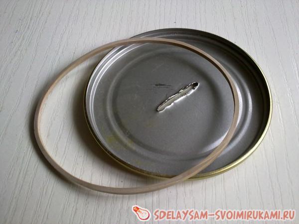 Крышку переворачиваем и избавляемся от резинки, проходящей по её периметру. Дело в том, что крышку с резинкой одеть на консервную банку невозможно, ввиду того, что диаметр последней на несколько миллиметров больше, чем диаметр крышки.