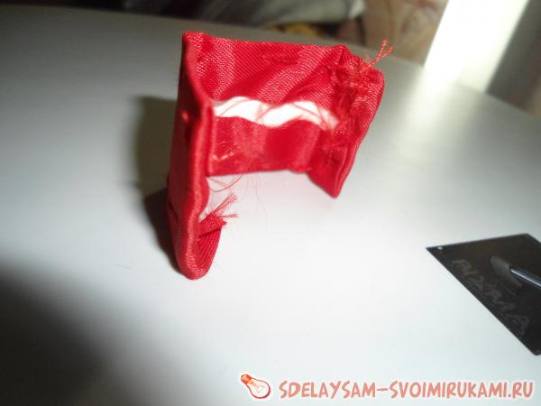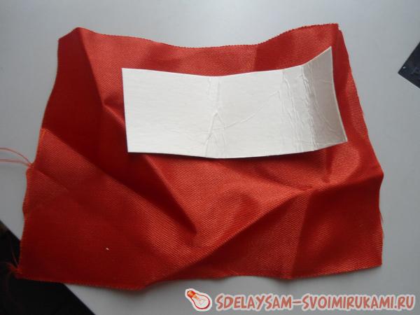 Обмеряем вокруг картонной бумаги тканью или лентой, делаем ленту нужно размера, обрезаем и сшиваем обычными стежками картонку с тканью.