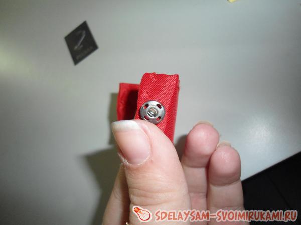 Теперь пришиваем заклепку. Сначала с одной стороны, а потом с другой. Тут главное не промахнуться с местом пришивания, чтобы не было криво или косо.