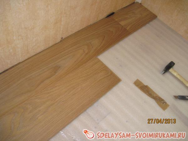 Листы подложки аккуратно раскладываются и проклеиваются по стыку крепким скотчем. На этом этапе нужно следить, чтоб не было нахлёстов подложки, так как это очень вредит ламинату.