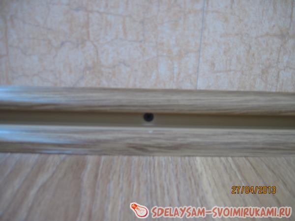 Далее монтируем плинтус с кабель-каналом. Для этого вытаскиваем из плинтуса центральную планку и прикручиваем плинтус к стене саморезами, либо прибиваем на дюбель-гвозди, просверлив отверстия в стенах.