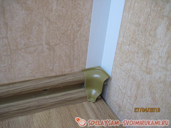 Во внешние и внутренние углы монтируем угловые элементы для плинтуса, гармонирующие по цвету с плинтусом.
