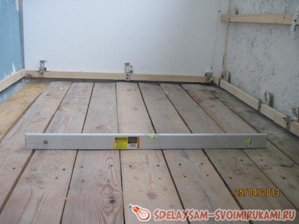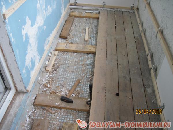 На новые лаги настелили черновой пол из наборной доски толщиной 35 мм. Новые доски закрепили длинными саморезами.
