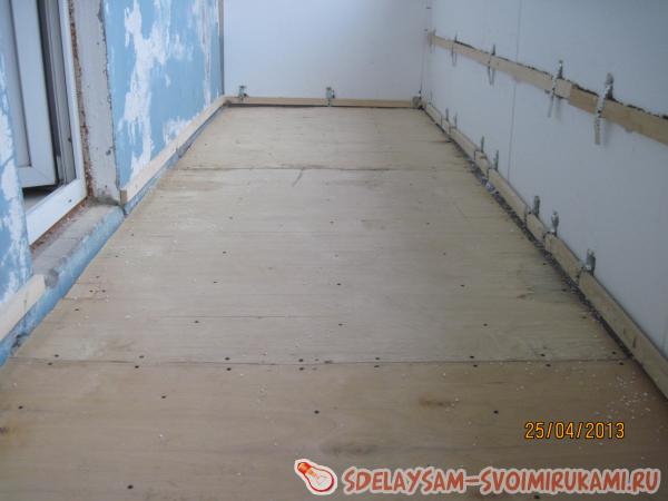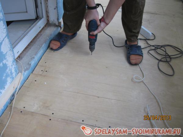 После этого на пол положили слой листовой фанеры толщиной 5 мм, который надёжно подшили саморезами к нижнему дощатому полу.