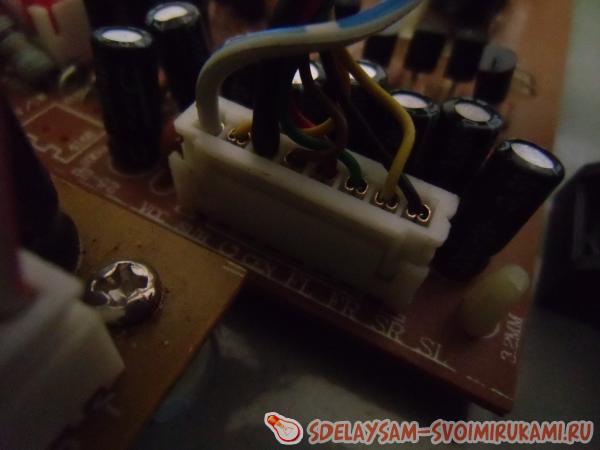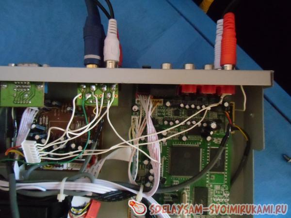 Буду выражаться как можно более простым языком для тех, кто в этом ничего не понимает, но мысль его заинтересовала. На фото 4 показано все устройство домашнего кинотеатра. Большая часть его составляющих мне не требовалось. Интересующей деталью является плата в верхней левой части фото 4. Это и есть блок усилителей, отвечающих за объемное звучание 5.1. Мне нужно было подвести шесть линейных сигналов звуковой карты к данному блоку. Благо на плате есть разъем с надписями всех каналов, к котором подходят сигналы с проигрывателя.