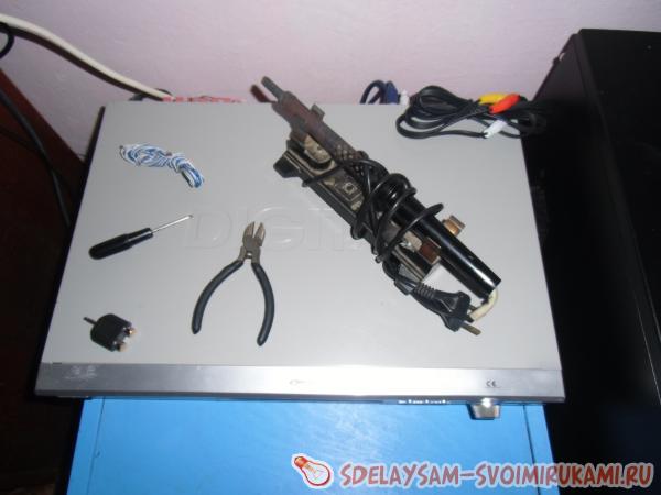 Чтобы сделать качественный звук мне понадобились: из инструментов отвертка, кусачки и паяльник, а из материала провод, акустический кабель с RCA-разъемами, и двухканальные переходники.