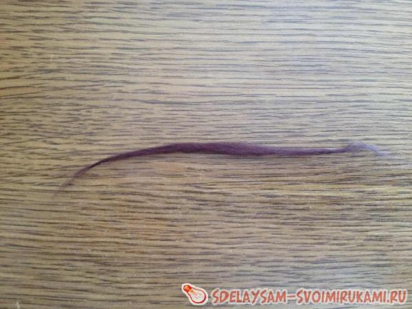 Когда войлочные шарики высохли, можно приступить к их украшению. Для этого возьмем немного войлока другого цвета и вытянем его на подобие шнурка.