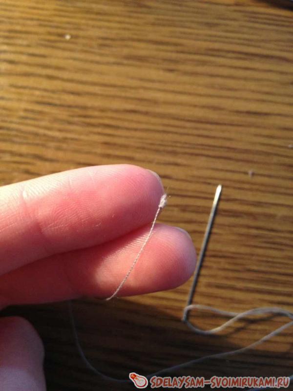 Теперь возьмем иголку и нитку. На одном конце нитки нужно завязать очень плотный узелок.