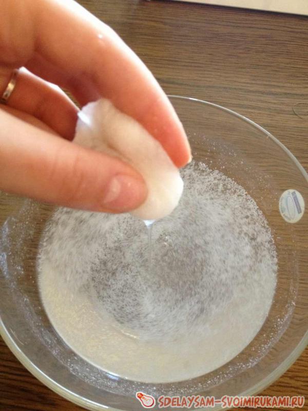 Возьмем немного белого войлока и замочим его в мыльном растворе. Количество войлока зависит от желаемого размера шариков, но обязательно учитывайте, что при валянии он уменьшится раза в два.