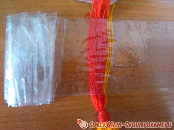 Дальше нужно определиться с цветами и нитками. Стоит отметить, что для каждого узелка есть возможность быть двух цветов: той нитки, которой плетется, и той, которая взята за основу. Т.е. у каждого столбца может быть свой цвет, но мы взяли два цвета: одни для фона(желтый) и один для надписи (красный). Т.к. высота надписи будет равна девяти, то нужно взять девять ниток цвета надписи (красного) и одну длинную нитку цвета фона (желтого). Связываем их вместе узелком и закрепляем на столе скотчем, как это показано на рисунке.